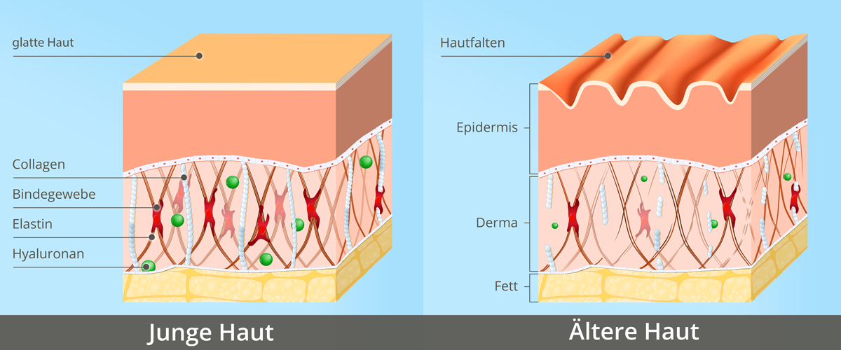 Die entscheidenden Veränderungen im Hautalterungsprozess sind in der Lederhaut (Dermis) festzustellen. In dieser Hautschicht werden in jungen Jahren ausreichende Mengen Collagen und Hyaluronan gebildet.