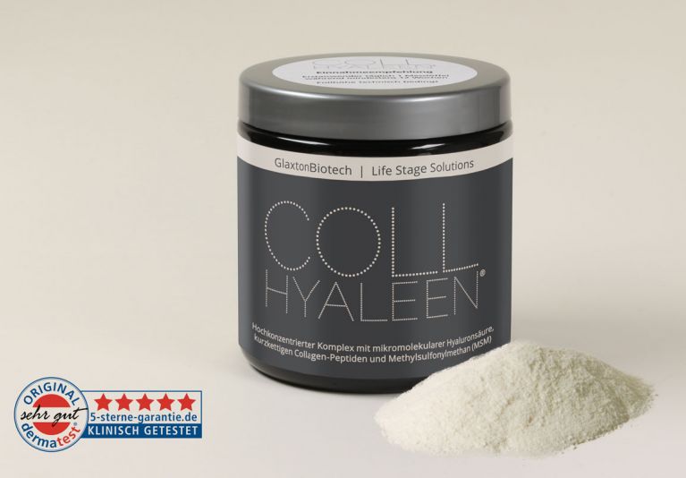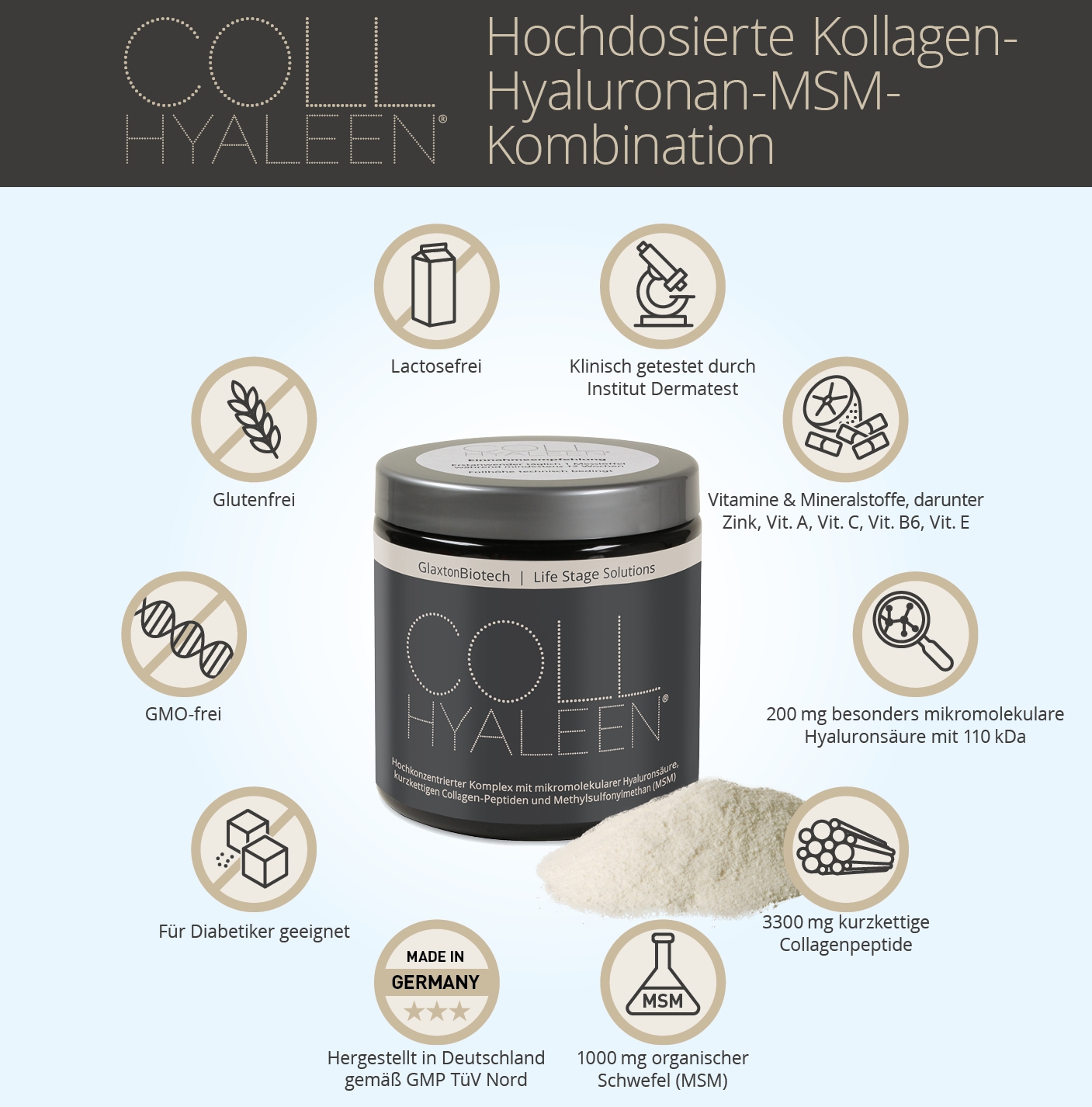 Collhyaleen® – mikromolekulare vegane Hyaluronsäure (200mg) Molekulargewicht 110 kda, MSM Methylsulfonylmethan (1000mg) und bioaktive Collagenpeptide (3250mg) - erstmals hochdosiert im Verbund.