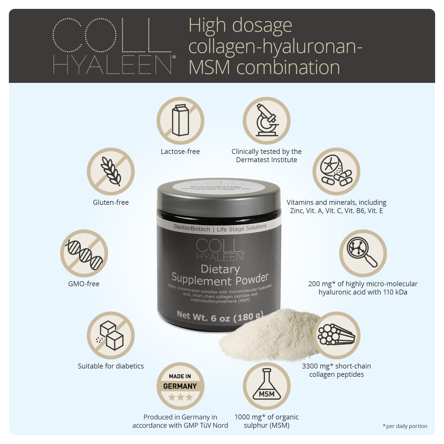 Collhyaleen® – bioactive Collagen peptides(3250mg), micromolecular vegan hyaluronic acid molecular weight 110 kDa (200mg) and MSM (methylsulfonylmethane, 1000mg) - combined for the first time in high doses.
